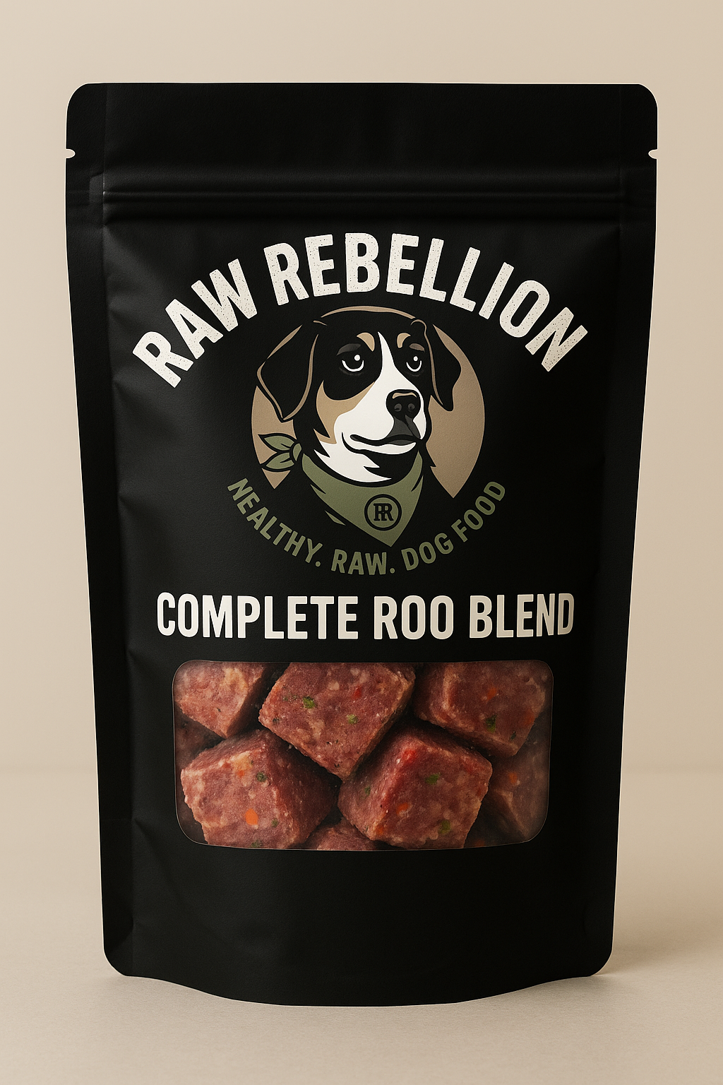 We prepare a complete and balanced raw mix made from wild-harvested kangaroo meat, organs, bone, vegetables and healthy fats — everything your dog needs to thrive.